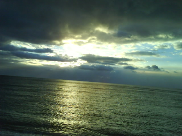 車上一開始挺擁擠的,過了幾站,人少了些,便和樂樂縮到車尾的一角,哇啦哇啦聊著對科系、對閱讀習慣的一些小想法(或許是我不會控制音量的關係,乘客迅速地減少了囧)。窗外是一片海,陽光從傍晚的雲層中透將出來,把海面映成金碧輝煌的漂亮藍色。待我們話題告一段落,天色已暗了下來,不多時就到墾丁了。