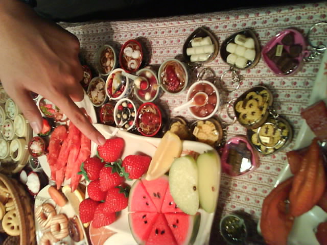 回到旅社稍歇一會,約莫十點鐘,便出發前往墾丁大街。不過一行人逛著逛著,始終沒有真正在哪個小吃攤前停下來,倒是買了幾樣造型精緻、幾可亂真、但不能入口的食物模型,我買了一碗綠豆湯、亮群則買了一碗紅豆湯,算是一對XD。後來真的渴了、也有了些睡意,才想要買點飲品解解饞。看到五十嵐鐵門已拉了大半,只好轉去鮮茶道買了杯大吉嶺紅茶。店內工作的小夥子聊得很大聲、語氣也很快活,靜動之間似乎有如墾丁陽光一般的熱力。一會,一個中年婦女騎機車停到店門前,店員們看到了,便爭先恐後地跑到櫃檯前大叫「噢噢!老闆娘嘿!」「老老老老老闆娘!」,婦人瞪了他們一眼,罵道:「靠腰!吵些什麼!」我在櫃檯前,鼓足力氣才忍住了笑聲;他們讓我回想起國中一群自由自在的朋友們,同樣也是活力十足;整條大街上花花綠綠的少男少女,多少都擁有這樣的活力吧!