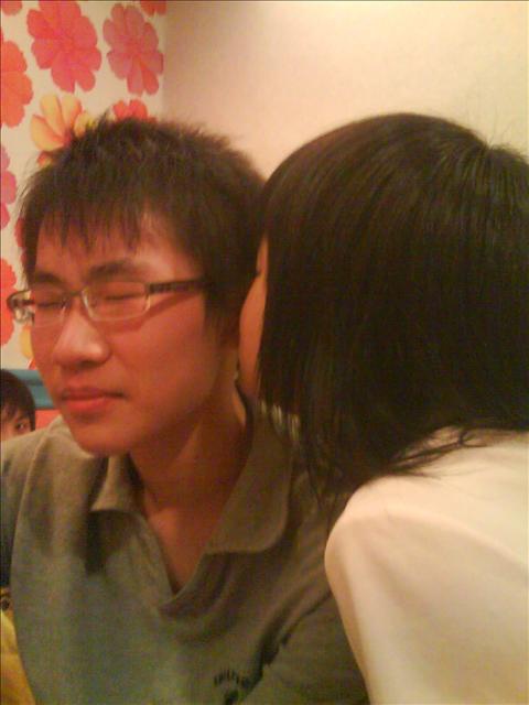亮群和學宇第一個遭到處罰,噢那時候亮群的眼神真的悽涼極了,不過他們從外面買餅乾回來後,神色似乎緩和多了ˇ;海海親樂樂的額頭,樂樂吻海海的耳朵,海海在寶怡的相簿裡嘴巴和眼睛都閉的死緊,看起來超緊張又超靦腆的XDD;親吻戲碼是我首先提起的,結果下一輪就立刻來了現世報囧,要彎腰吻樂樂的手背(又是樂樂);學宇穿著鮮綠外套、害羞地隔著枕頭抱住樂樂(又是樂樂!人氣很旺耶XD),寬厚的肩膀從背後看像一隻綠色的柔軟的大熊;後來,經驗老到、一直都能及早脫身的以箴,可能是理智開始渙散了或風水輪轉,被學宇用嘴從臉一直吹風吹到腰部,學宇吹起風來感覺也挺溫柔的:D,冠倫和寶怡存活到了最後,沒受到半點處罰;如果暑假還有機會出去玩就要玩炸他們!